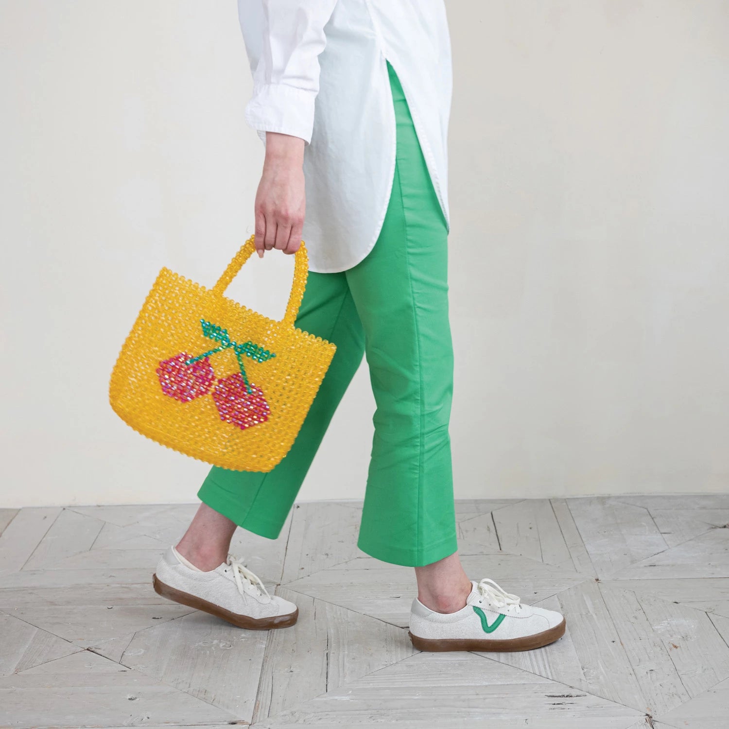 Handcrafted Acrylic Beaded Handbag measuring 9-1/2" long by 2-1/2" wide and 8" high, featuring iridescent heart and fruit designs. Available in four fun styles to brighten your day.