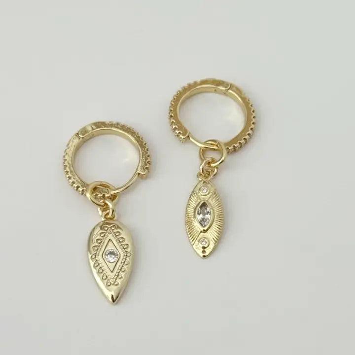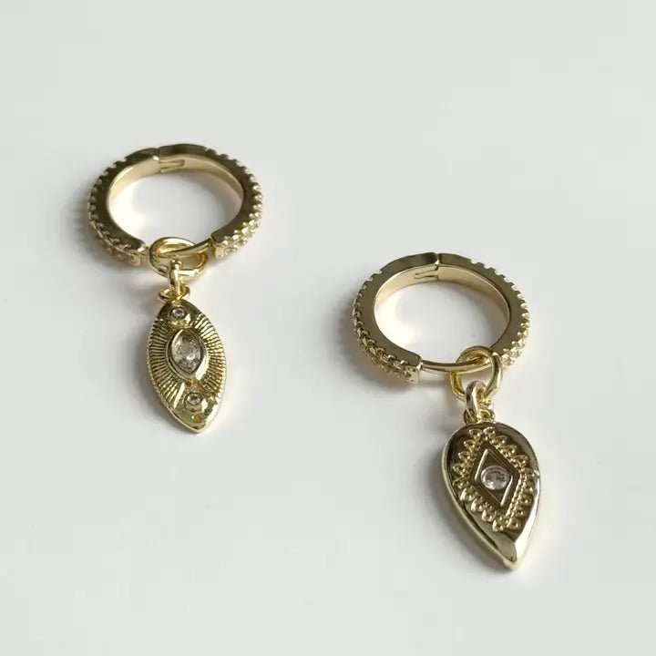 Pair of 14K Gold filled hoops embedded with clear CZ stones featuring gold filled charms Tramps+Thieves Design Made in Los Angeles