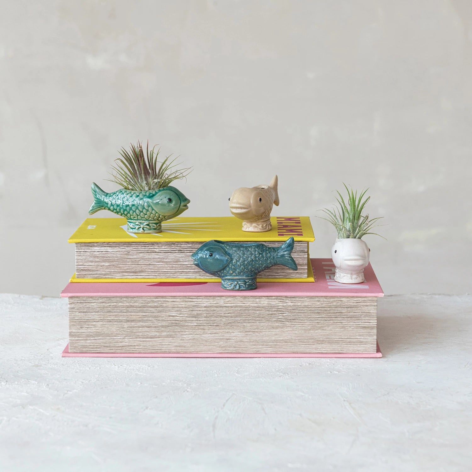 This charming fish-shaped footed container doubles as a toothpick holder, crafted from stoneware with a fun reactive glaze finish. Available in four unique colors, each piece offers its own delightful variation.
