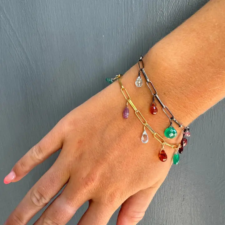 Our vermeil is sterling silver dipped in 16k gold. Findings are sterling silver and 14k gold fill. Handmade in Oakland, CA. * multi stone * sterling silver, vermeil & gold fill * 7 1/2” long * made in Oakland, CA