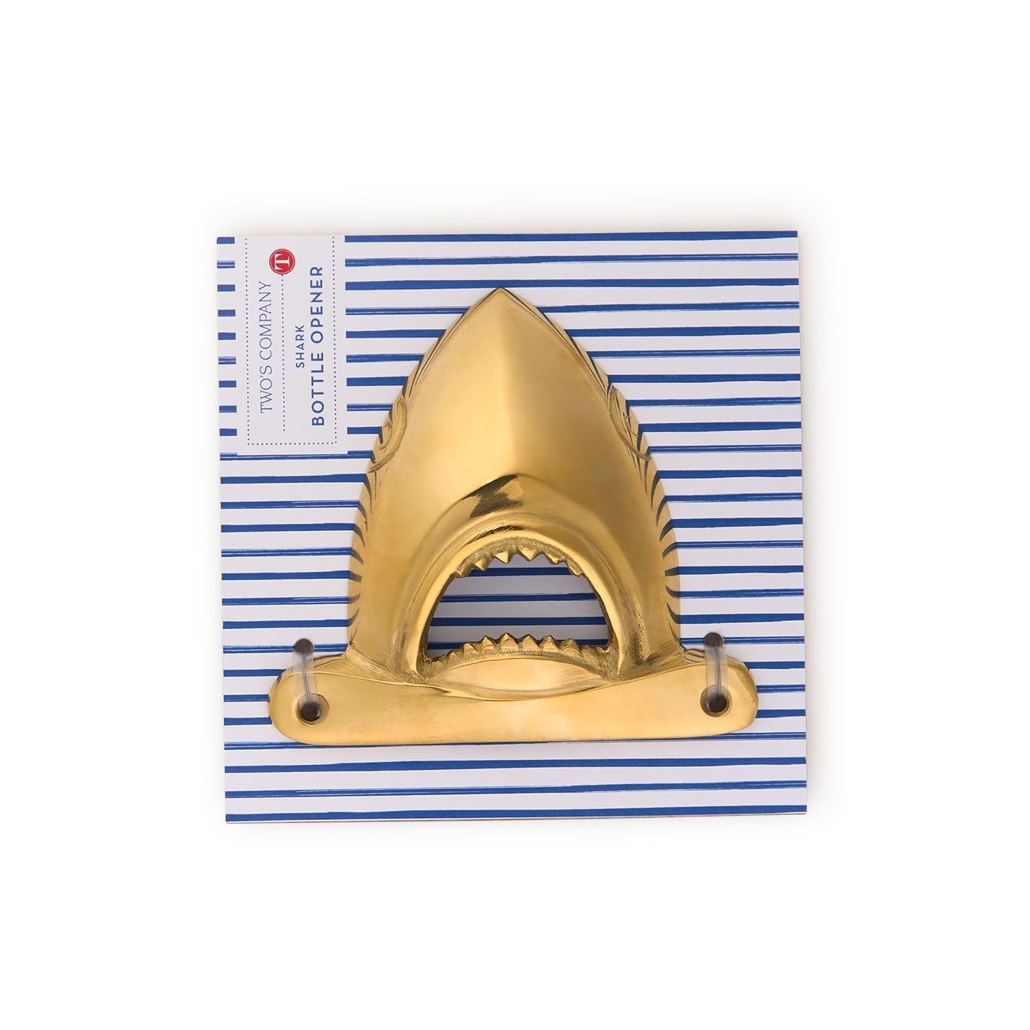 Shark! Crafted from solid brass, it's mountable and practical as a stylish bar tool. Presented on a decorative gift card, it's perfect for gifting to nautical enthusiasts or hosts.