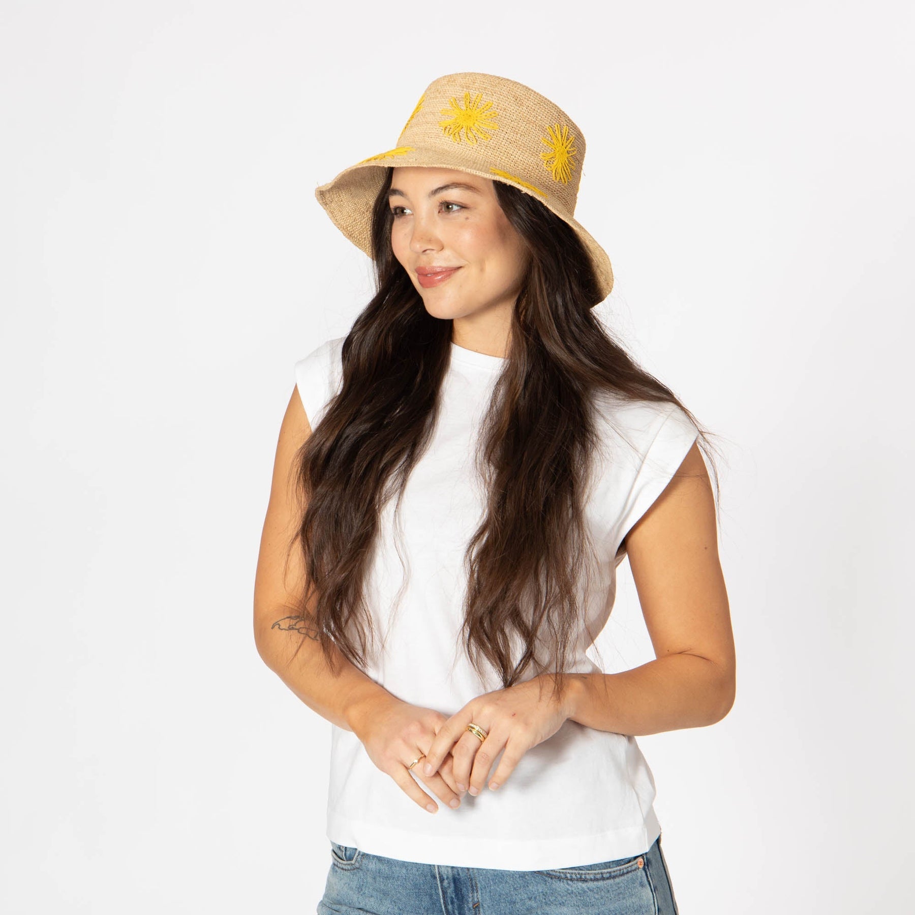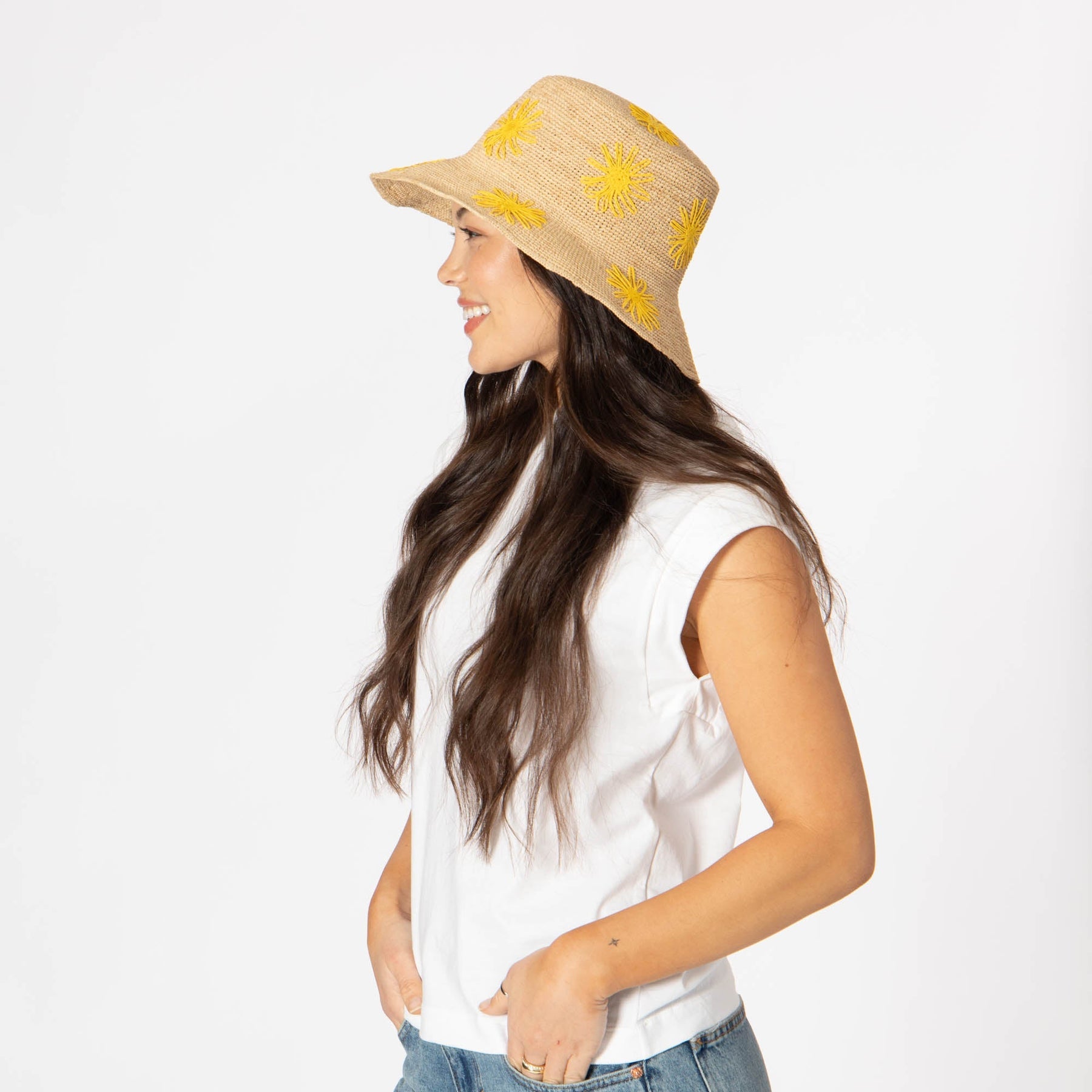 Stay stylish and protected with our Sol - Crochet Raffia Bucket hat! Made from 100% raffia, it features a 3.5" brim and UPF 50+ sun protection. The colorful embroidered flowers add a playful touch, and with adjustable sizing, you'll have the perfect fit.