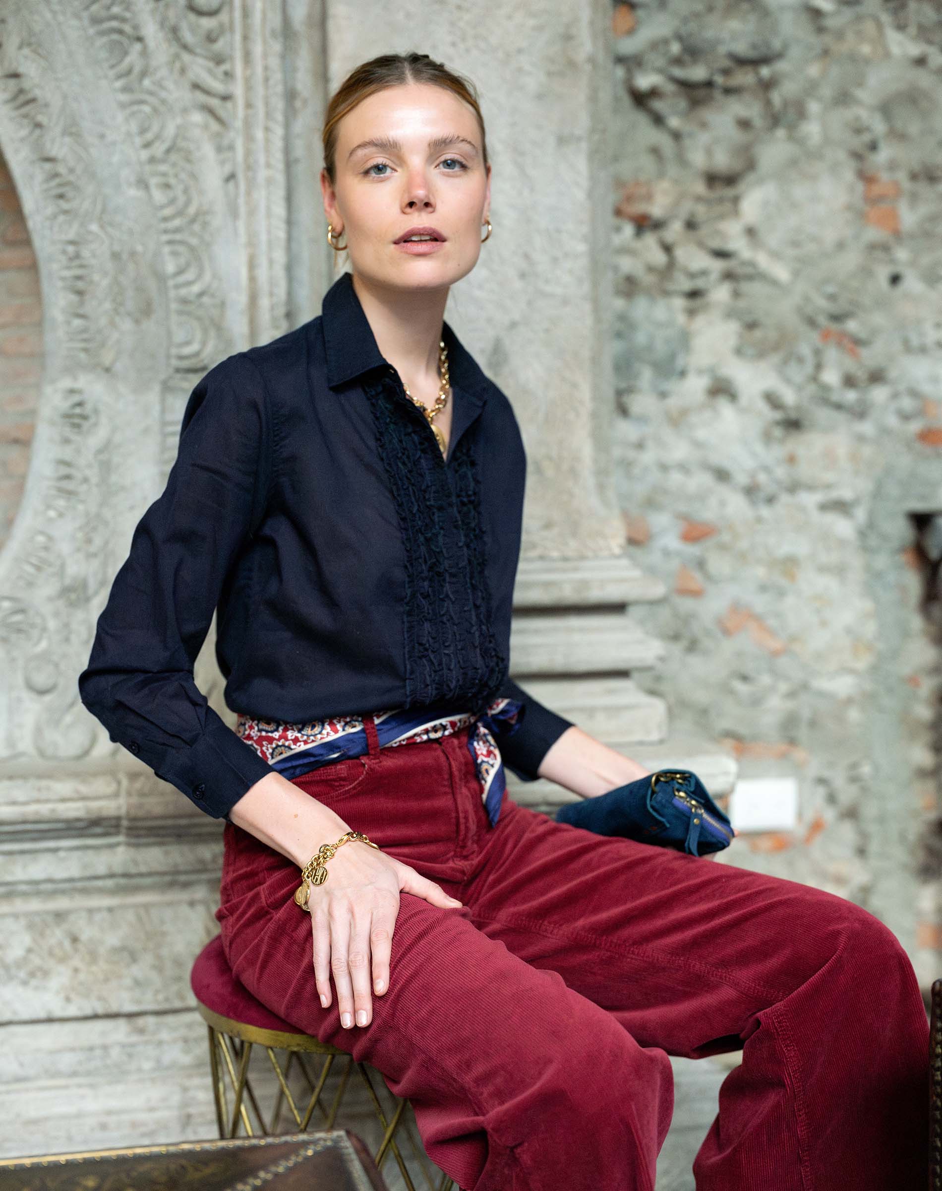 We like to play dress up and this piece is one you'll want for fun nights out or looking chic for a button-down kind of day. The ruffle placket chest details fit a classy tuxedo look with a twist for the modern woman. The next time you're heading out, layer your Tuxedo Ruffle for a fancy flare.