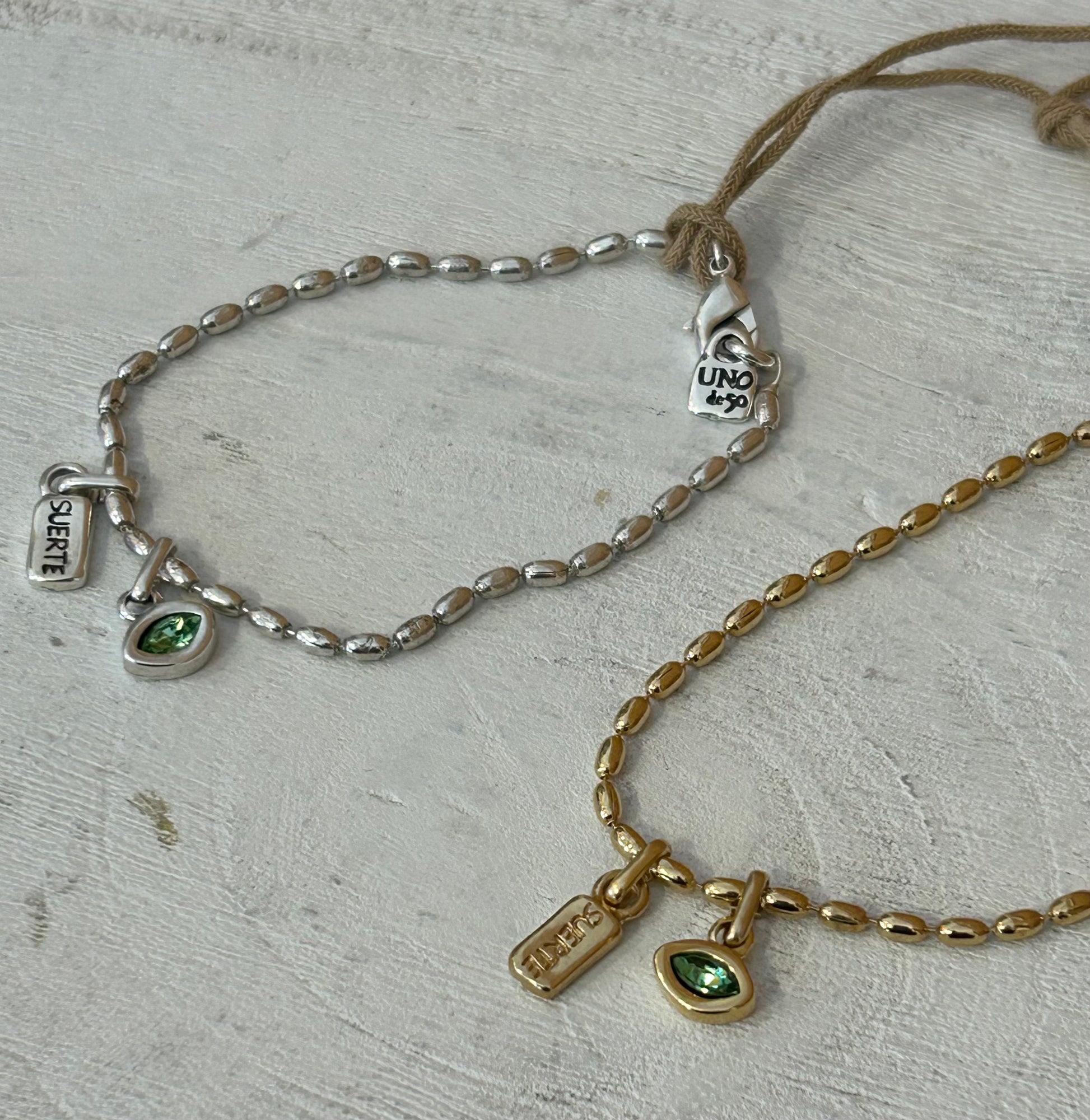 18K gold or sterling-plated bracelet with small oval link chain and a carabiner clasp and good luck charms: an oval medallion with SWAROVSKI® ELEMENTS crystal and Suerte tag. This piece is 100% handcrafted in Spain.